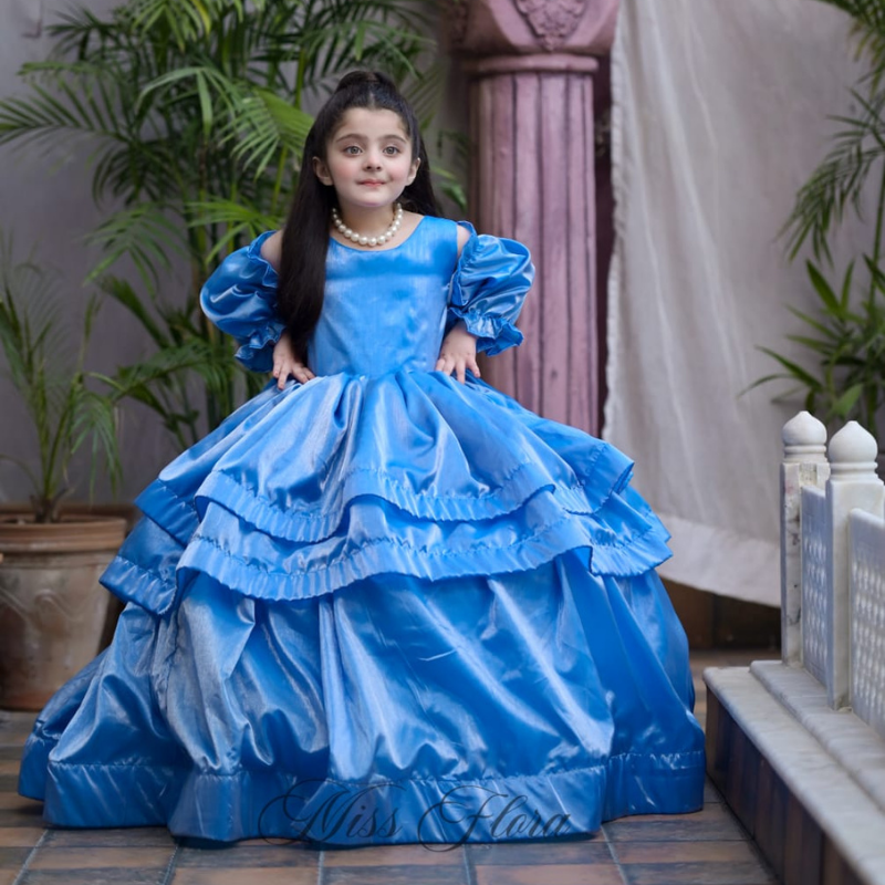 Balloon Fancy Frock – A princess-style frock with layered design, glossy finish, and puff sleeves. Perfect for birthdays and special occasions. Sizes 4–14 years.