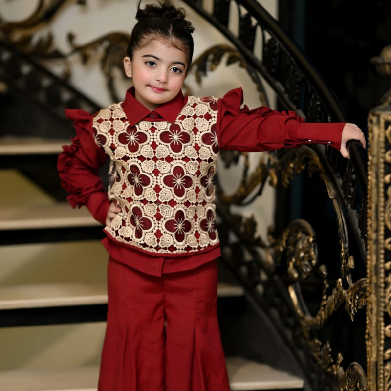 Crimson Crown Set is a stylish maroon outfit with matching bottoms and an embroidered vest, perfect for festive events and special occasions. Available in sizes 5–10 years.