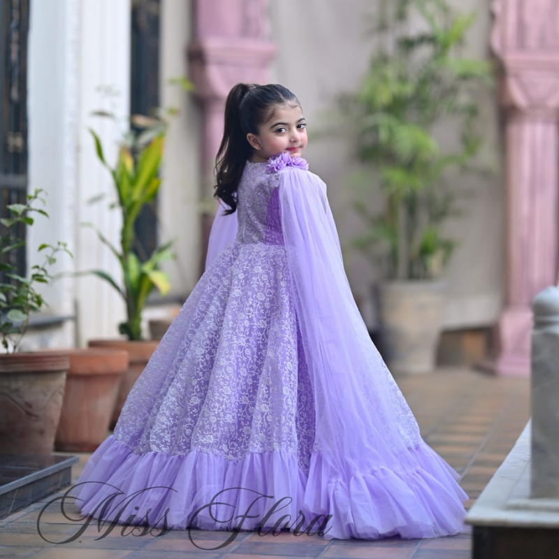 Lavender Dream Cape Frock is a soft lavender fancy frock with delicate embroidery and a net cape, perfect for special occasions for girls aged 6–12 years.